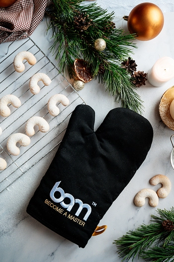 With its modern design and its elegant yet neutral black colour, the BAM Baking Glove has become a pastry chef's best friend. It protects your hands from hot baking trays with fresh biscuits on them. And thanks to its non-slip material, it will keep hot pots and baking trays from slipping out of your hands. The BAM Baking Glove is not suitable for machine washing or tumble drying. The size of the glove is 29 cm x 17 cm.