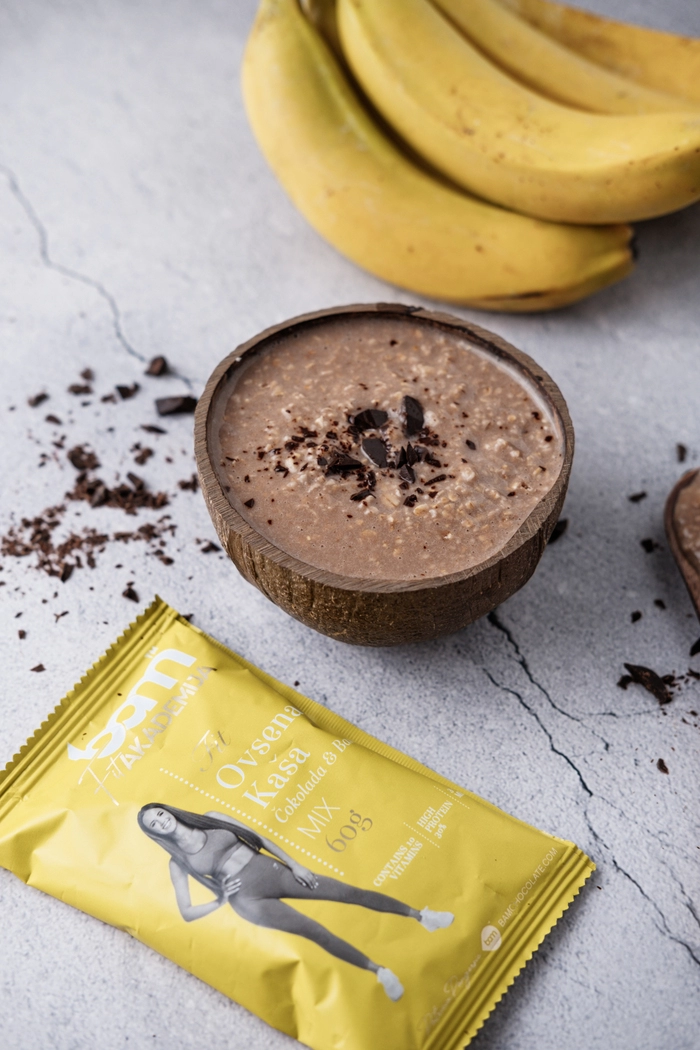 Oat flakes 55%, whey protein concentrate 28.9%, corn starch, modified corn starch, chocolate 2.5% (sweetener: D-maltitol, cocoa butter, cocoa mass, low-fat cocoa powder, emulsifier sunflower lecithin, bourbon extract vanilla), freeze-dried banana 1%, low-fat cocoa powder (10-12%), flavors, salt, vitamin complex (C, E, B1, B2, B5, B6, B9, B12, niacin, biotin), sweetener ( sucralose). Dry cocoa solids at least 54%.