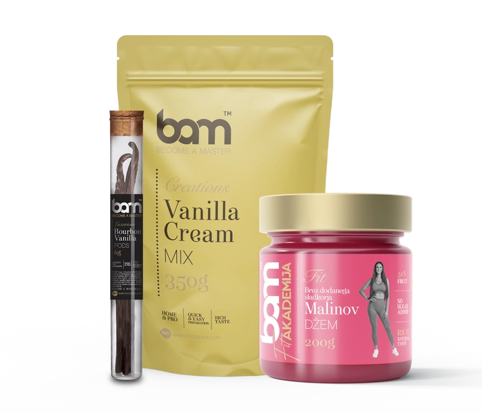 The Vanilla Raspberry Cake Pack contains BAM Vanilla Cream, which has a rich vanilla flavour and a creamy, smooth texture. It is easy to prepare and does not need to be cooked, just cold milk is added . Add BAM raspberry jam, which contains more than 50% raspberries, to give the vanilla cake its freshness. The jam is suitable for both freezing and baking. The pack also contains BAM vanilla pods, which have an exceptional vanilla flavour and aroma and are therefore suitable for preparing and enriching a wide variety of confectionery. They are ideal for making homemade vanilla custard or vanilla ice cream, and can also be used to flavour various biscuits and custards. Vanilla cream, together with the pods and raspberries, creates a combination of flavours that can be used to make a vanilla cake with raspberries.