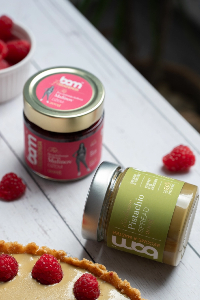 BAM Vanilla Paste made from Madagascar bourbon vanilla is alcohol-free and enriches the taste and appearance of any dish. Thanks to the practical tube packaging, the paste is always fresh and the dosage is precise. BAM Pistachio spread is known for its creamy texture and authentic pistachio flavour. BAM Raspberry jam without added sugar is full of antioxidants that indulge the taste buds with a fresh taste, while providing the body with fibre and vitamins, BAM White chocolate.