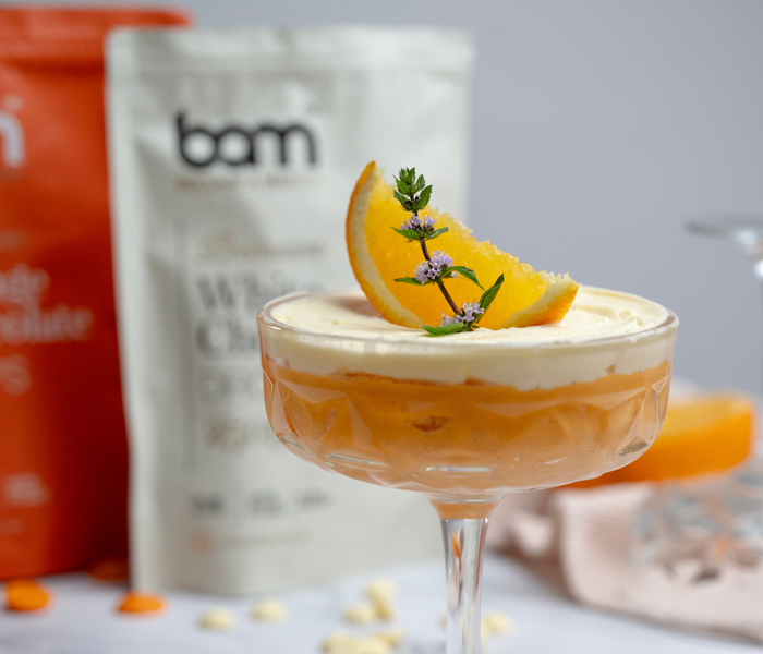To make the orange mousse, first heat 150 ml of sweet cream until almost boiling. Once the cream is heated, pour it over the BAM orange chocolate. Stir gently until the chocolate is completely melted and the mixture is silky. Then stir in the Aperol for the perfect combination of refreshing flavour and sweetness.