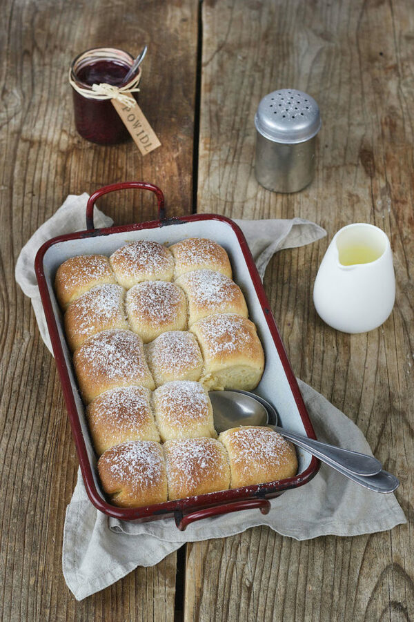 Preheat the oven to 180 degrees above and below. Brush with melted butter and bake on a medium rack for about 20 minutes. Brush the buns 1-2 times with the remaining butter during baking. Sprinkle the baguettes with more icing sugar.