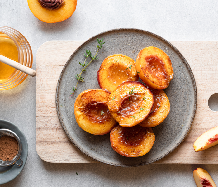 Place the baked peaches on a plate. Add a scoop of vanilla ice cream or a spoonful of Greek yoghurt on top of each half.