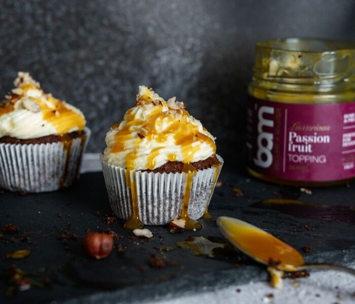 Poke small holes in the cooled chocolate muffins and fill them with BAM passion fruit topping.