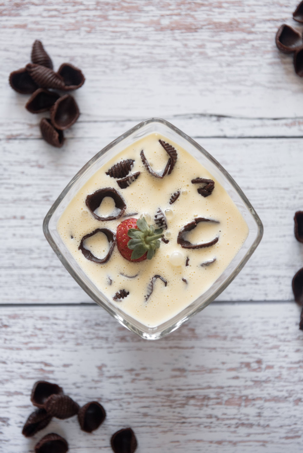 3 Use a large glass jar. Place a handful of chocolate pasta in the bottom of the jar first, then fill the jar 3/4 full with a piping bag. Arrange a few more chocolate shells on top of the custard, sprinkle with golden edible dust, then sprinkle the custard over the top of the custard. Place the dessert jars back in the fridge so that the dessert is chilled when served.