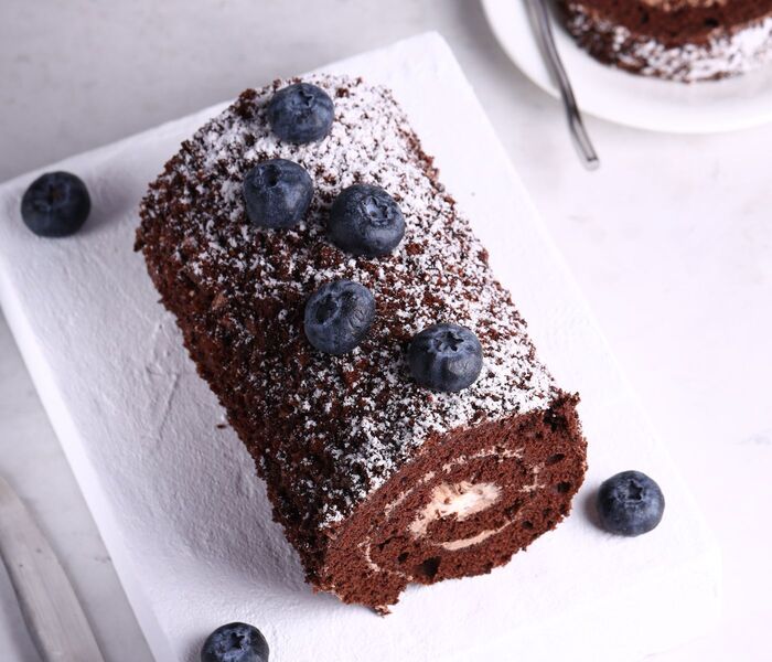 When the sponge cake has cooled, carefully unroll it. Spread the chocolate cream evenly over the sponge. Then roll back up and refrigerate for at least 1 hour to set the custard and allow the flavours to bind.