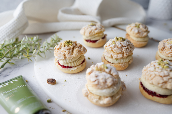 BAM Cream puffs with pistachio cream and white chocolate en