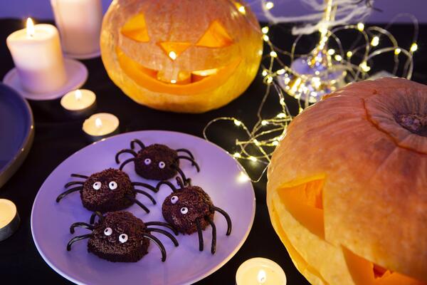 Use a small spatula to spread the chocolate icing evenly over the muffins and dip them in the chocolate crumbs. Place two eye-shaped candies on top of each muffin. Then add the chocolate legs in the shape of chocolate spaghetti to the spiders. Serve the chocolate spiders.