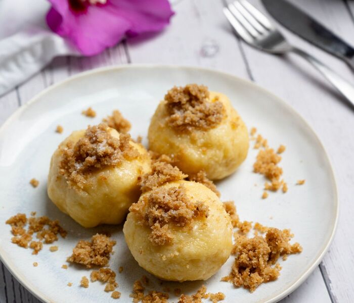 Drain the cooked dumplings and roll them in the fried breadcrumbs, then sprinkle them with a little sugar.
