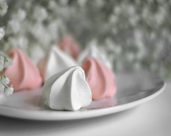 Stick the meringues on the baking tray, leaving at least a centimetre of space between them for air flow. Place on the centre rack to bake at 90 degrees for about 1 hour, then turn off the oven and leave it closed for another 1-2 hours. The meringue biscuits are ready when they are completely dry.