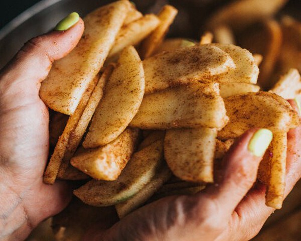 Clean the apples and cut them into thin slices. Roll out the puff pastry on a well-floured surface. Cut it into 9 equal pieces and place 4-5 pieces of apple in the middle of each piece. Add a little cinnamon and BAM vanilla paste. Sprinkle a spoonful of sugar on top.