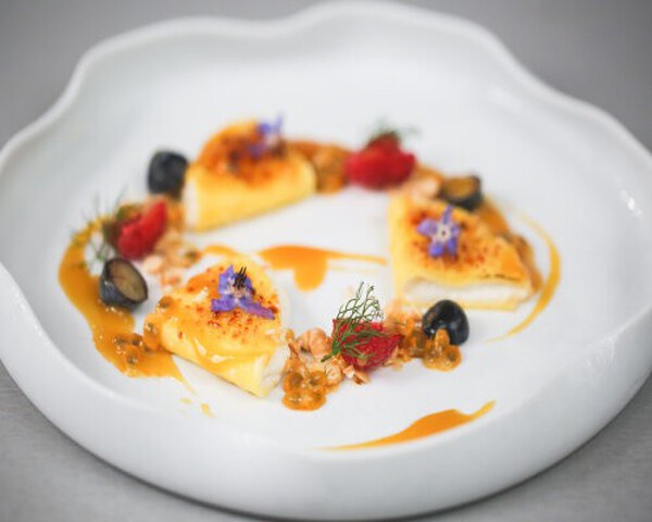 1 Cut the fresh passion fruit in half. Cut the raspberries and blueberries in the same way. Slice the hazelnuts, making sure there is a larger piece in between to give a distinct hazelnut flavour. Prepare the BAM passion fruit topping, brown sugar and the torch. Now go back to the online training and follow the step-by-step plate decoration I showed you. And have a good run!