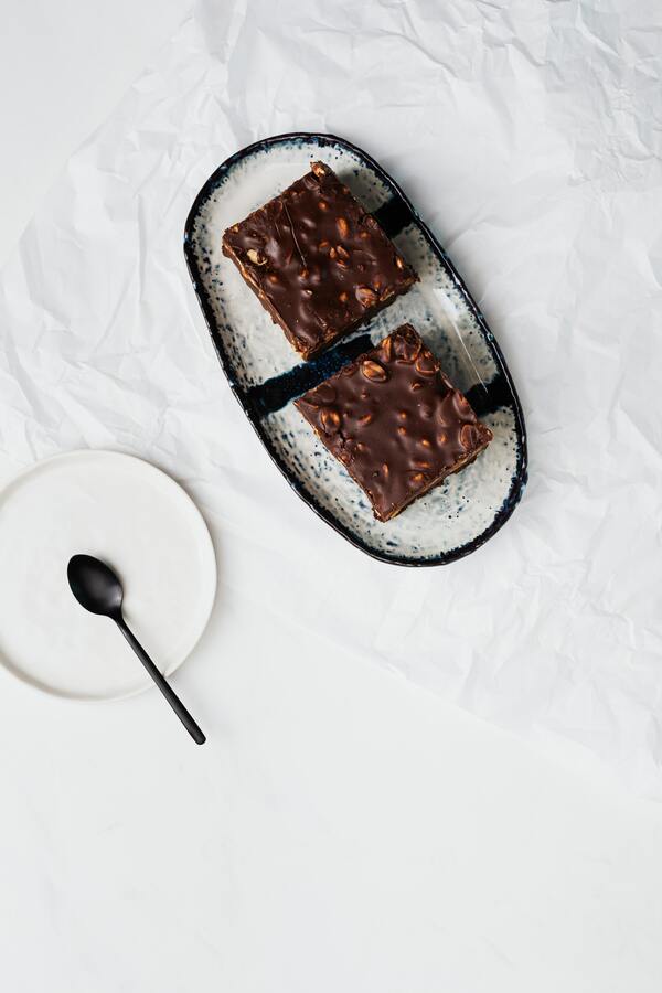 In the last step, melt the BAM dark chocolate and prepare the topping. Melt the chocolate using a water bath or microwave. Stir the chocolate more frequently if using the microwave. Once the chocolate is completely melted, stir in the coconut oil and pour over the caramel layer. Allow the brownies to cool completely in the fridge, then slice.