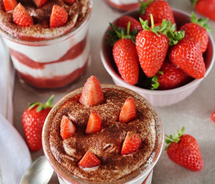 Place a layer of biscuits in the tiramisu glasses, then a layer of strawberry cream with sliced strawberries, then another layer of cream. Repeat the process until all the ingredients are used, finishing with a layer of vanilla cream.